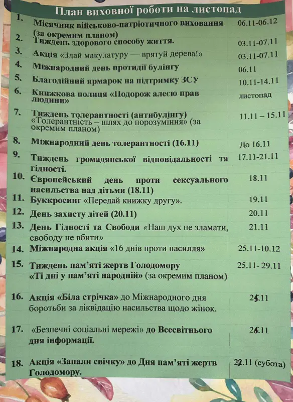 Календарне планування виховної діяльності та заходів